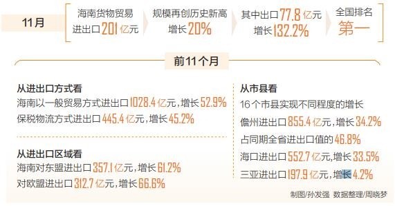 本报海口12月13日讯 (记者周晓梦 通讯员林柏荣)12月13日,海南日报记者从海口海关获悉,2022年前11个月,海南货物贸易进出口总值1826.3亿元,同比(下同)增长40.1%,快于同期全国增速31.5个百分点,增速全国排名第三。