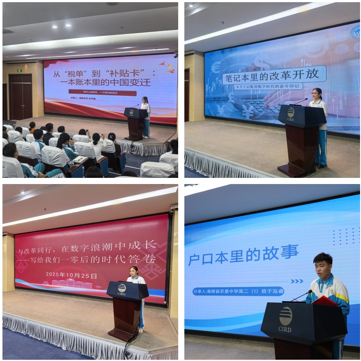 现场还进行了“时代印记·改革开放在心中”为主题的改革开放实物史料分享活动。来自海南中学朱可馨从爷爷和父亲两代经历中分享了“‘税单’到‘补贴卡’:一本账本里的中国变迁”的故事,潘品秀分享了加入WTO历史背景下妈妈手工记账到数字时代的奋斗印记,海南省农垦中学于泓睿从小新海南人角度分享“户口本里的故事”,以及来自国兴中学肖雨晨同学带来的对当前数字浪潮下青少年与改革同行的思考。