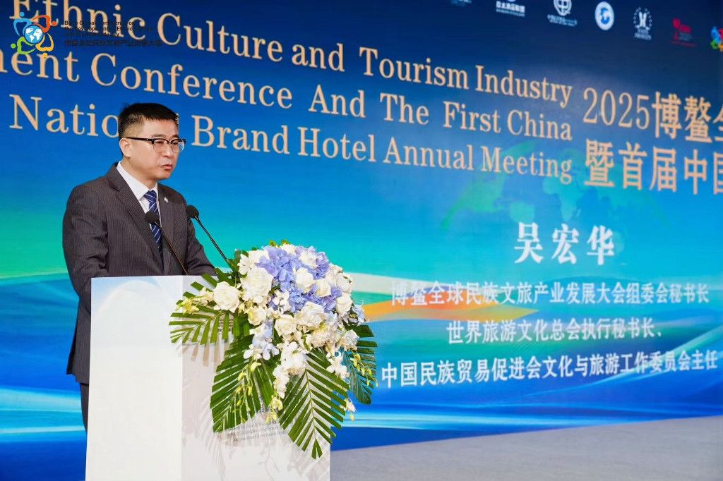 (中国民族贸易促进会文化与旅游工作委员会主任、世界旅游文化总会执行秘书长、博鳌全球民族文旅产业发展大会组委会秘书长、亚太酒店联盟创始主席、IFBA国际食品饮料(中国区)主席吴宏华现场致辞)
