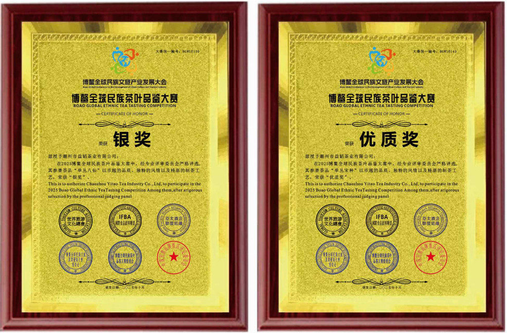 在激烈的角逐中,益韬茶业凭借过硬实力脱颖而出,旗下凤凰单丛茶“八仙”斩获银奖,“宋种”荣获优质奖,双奖加身的亮眼表现引发行业关注。国家一级评茶师、国家级潮州工夫茶艺非遗代表性传承人叶汉钟特别点评,益韬茶业的两款获奖茶品不仅延续了传统非遗工夫茶制茶工艺,更在文化表达上实现创新,完美契合大赛推动茶文化创新发展的宗旨。