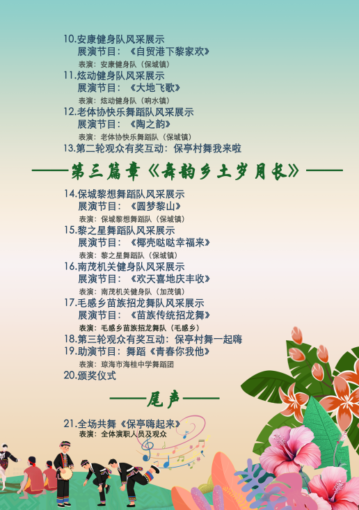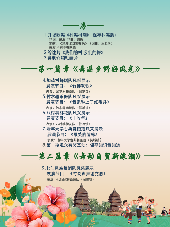 为增强现场互动性,展演设置“保亭知识我知道”“保亭村舞我来啦”“保亭村舞一起嗨”三轮互动环节,通过知识问答、笑脸定格、学跳村舞等趣味活动,让观众深度参与其中,并有机会获得东鹏饮料、特色花束、本地农产品等丰厚奖品。此外,斩获全国第十二届“群星奖”的海口市龙华区文化馆原创广场舞《椰壳哒哒幸福来》主演团队——琼海市海桂中学舞蹈团也将到场助阵,为活动注入青春活力。