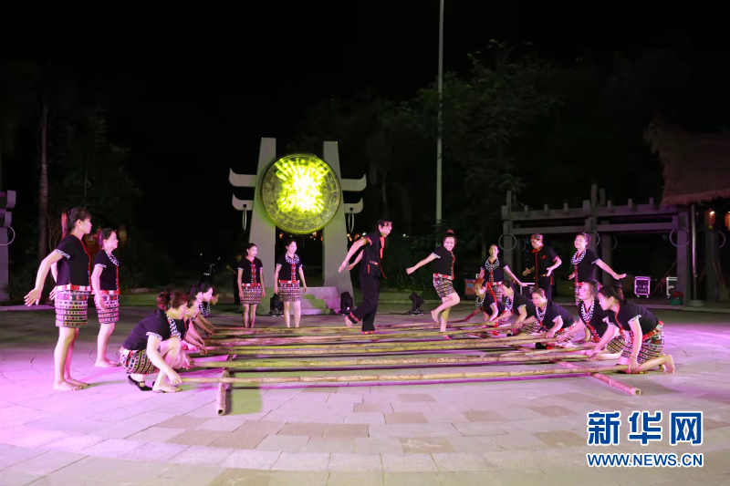 浪论村村民在村内广场上跳竹竿舞。新华网发(张帆 摄)