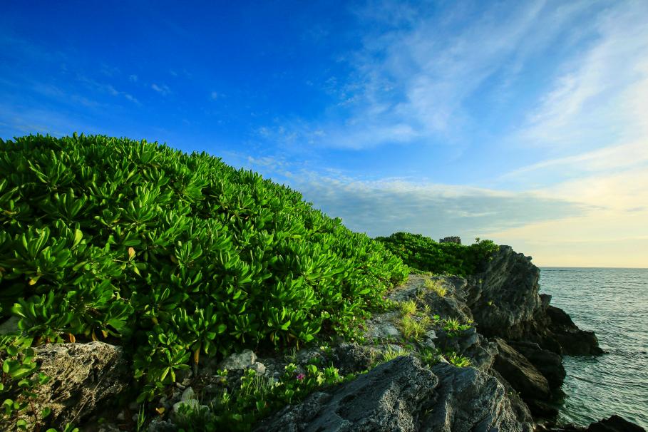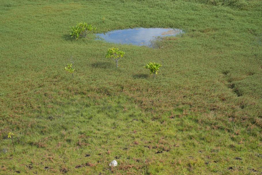 此前,守礁官兵与植物学专家联合开展环境巡查时,发现了这块长约650米、宽约40米的湿地,湿地上生长着数百株水芫花、毛马齿苋、海马齿苋、银毛树——这些都是礁盘上从未人工种植过的植物。专家随即对现场微地形、植物种类、土壤组成及水土质量展开初步分析并取样,最终确认其为近自然盐沼。