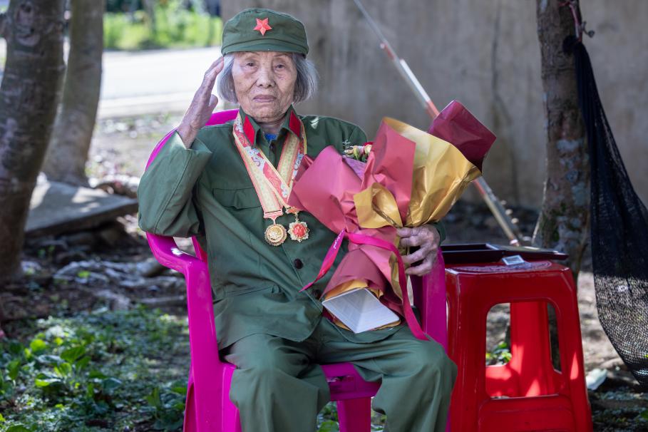 现场,海南省摄影家协会摄影师张江英为冯惠英拍摄肖像照和全家福。她特意换上旧军装,其子感慨道:“照片会说话,它告诉后人,我们为什么而战。”