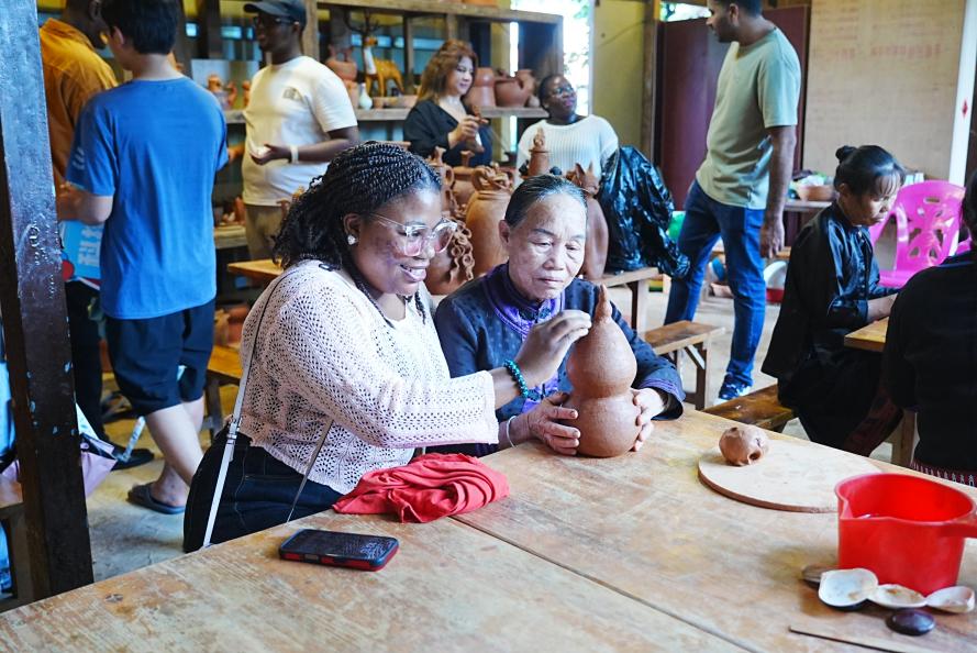 在三亚黎族原始制陶技艺传习所,黎族制陶非遗传承人展示了制陶的完整流程,其中最具特色的是在野外以篝火烧制。将阴干后的坯体置于木柴堆上点燃,烧至通红后洒上华楹树皮浸泡的汁水,淬火降温,从而形成各不相同的斑点纹饰,使得每个黎陶都成为独一无二的“限量版”。传承人还向学生们介绍了黎锦,并讲述特殊花纹的含义。中外学生纷纷触摸黎锦,赞叹黎锦技艺的精巧。