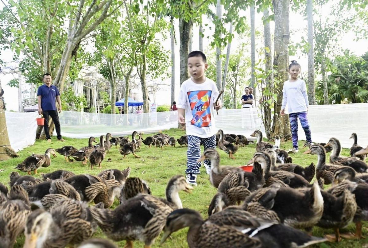 作为集现代农业示范、生态旅游、文化体验于一体的综合示范体,桂林洋国家热带农业公园此次构建了日间游乐与夜间消费联动的全域体验链。日间的神农文化园丰收市集上,地道美食与匠心手作引得游客驻足;田园互动区里,“鸭”力大作战、“鱼王争霸”等游戏让大人孩子在泥土水花中重拾乡野乐趣,“稻田溜达鸡”“绒绒鸭宝”等生态农产品实现从田间到餐桌的直接对接。农业梦工厂同步推出蓝莓主题计划,通过盆栽售卖与认养预约,打造“观光—认养—回购”的可持续农业模式。