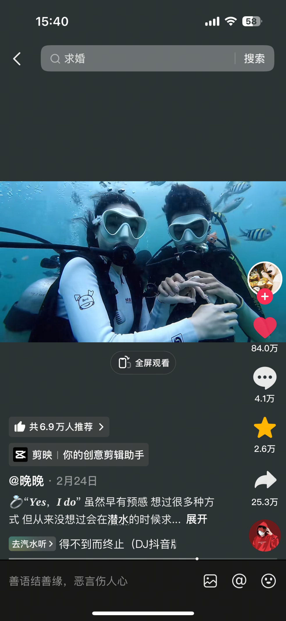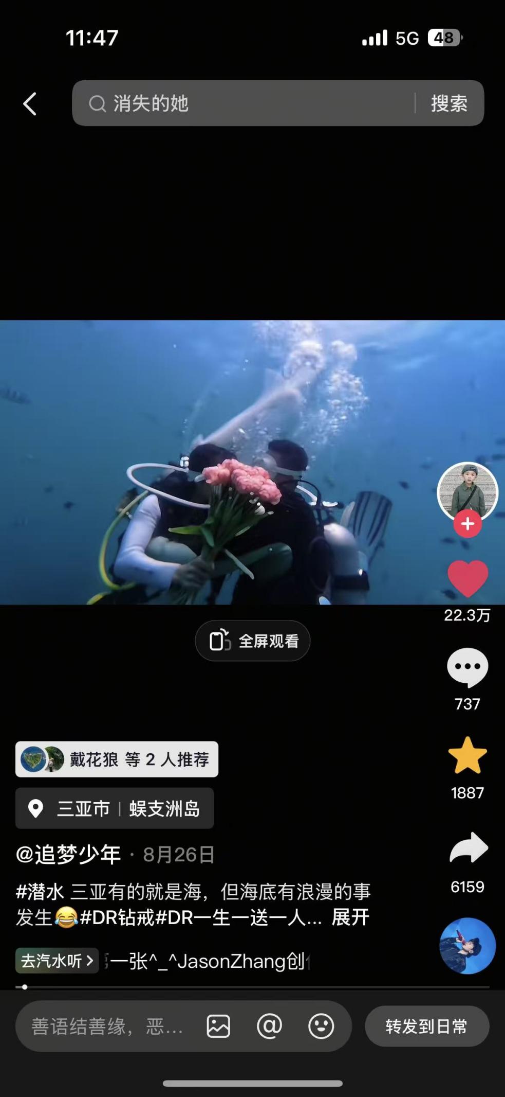 据了解,浙江游客陆先生向景区提出“水下求婚”需求后,蜈支洲岛立即量身定制方案:工作人员提前准备适配水下环境的钻戒、头纱与花束,规划专属海底路线,并协调潜水教练全程记录。在珊瑚环绕的海底,求婚仪式圆满完成。