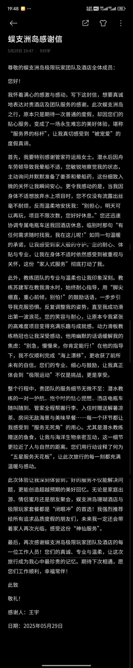 游客王宇在感谢信中详述暖心体验:潜水后晕船,“旅行天使”符运局主动送姜茶、晕船药,协调电瓶车送其回酒店;学习滑水时,教练苏建军反复指导助其克服恐惧;动力滑板教练杨冠用幽默缓解焦虑。她评价景区服务为“标杆”“天花板”,并表示将推荐给亲友。