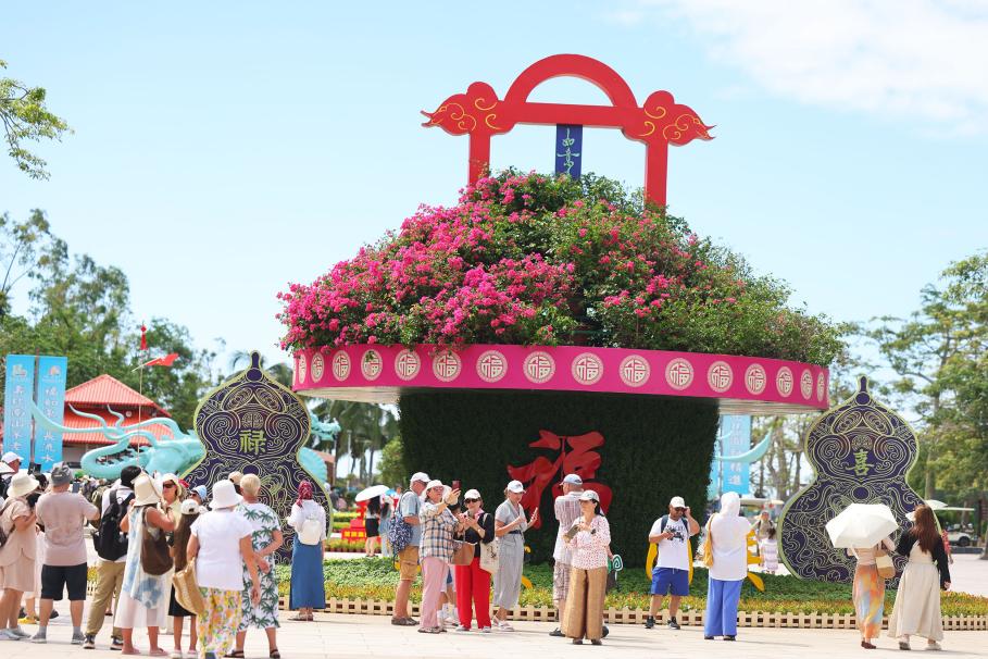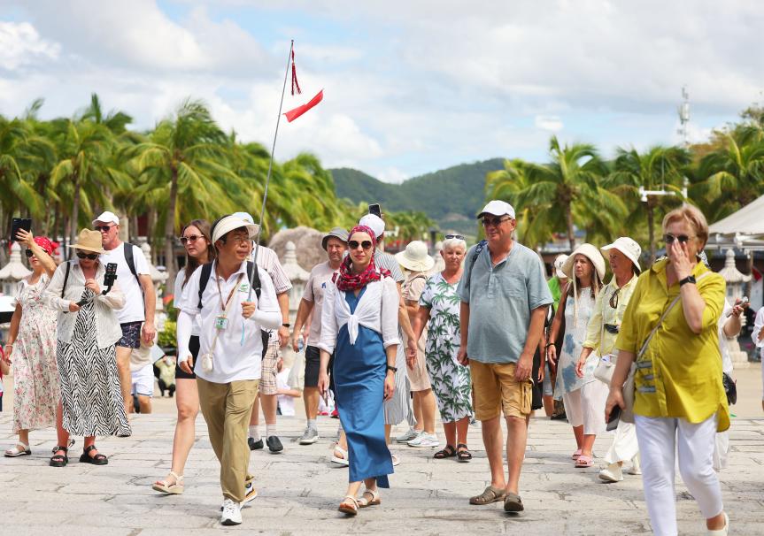 国庆中秋双节期间,三亚南山文化旅游区迎来客流高峰。晴好的天气下,景区内国旗迎风飘扬,处处洋溢着喜庆祥和的节日氛围。中外游客纷至沓来,在金秋时节畅游热带风光,感受独特人文魅力,尽享假期的惬意与悠闲。