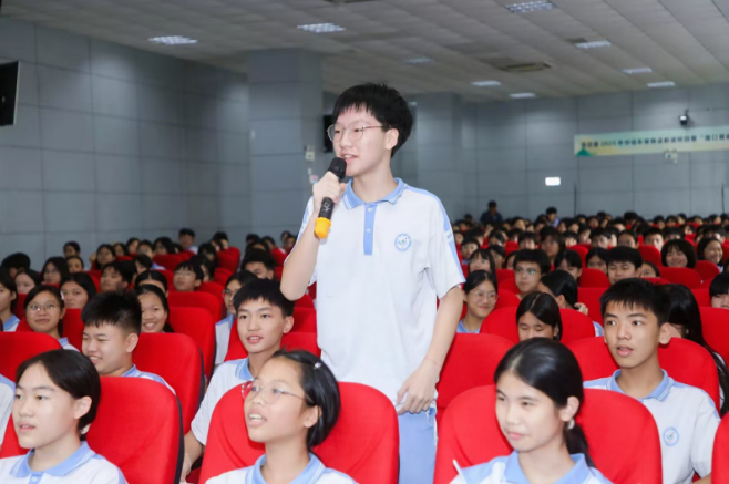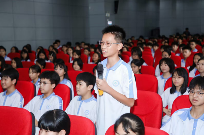 微话剧落幕后,互动环节更是点燃全场热情。“苏东坡”与学生保持角色对话,耐心解答“您在困难时如何调整心态”等问题;诗词接龙环节中,学生们踊跃接句,接过定制的“东坡书本”时满脸雀跃。此前,澄迈中学已通过课堂预习、诗词阅读等方式进行预热,为现场互动打下坚实基础。