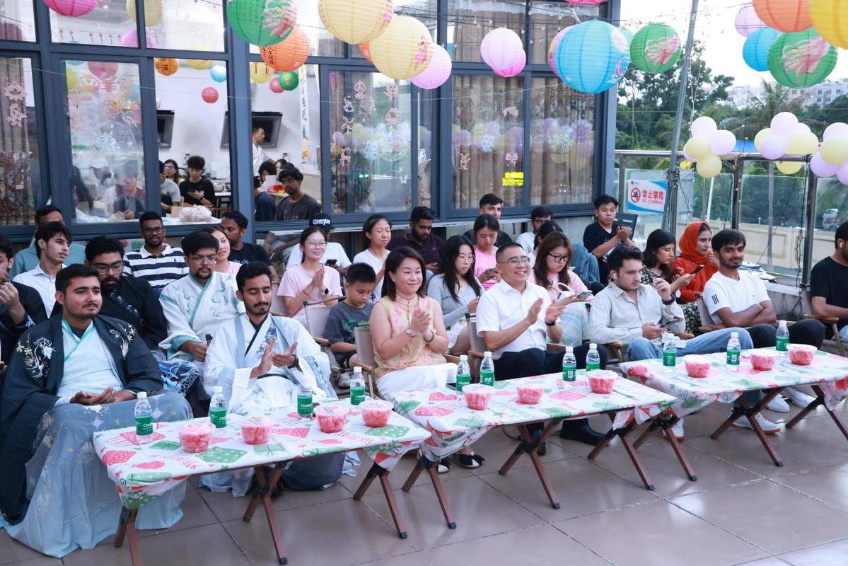 才艺表演将活动推向高潮。巴基斯坦留学生AQSA许糖献唱中文歌曲《如愿》,印度尼西亚学生CECILIA曾小青演绎粤语经典《喜欢你》,中国学生李玟洁则以《借月》营造静谧意境。汉服社成员身着传统服饰翩翩起舞,东帝汶学生带来活泼圆圈舞,现场欢声不断,多元文化在月光下交融共鸣。