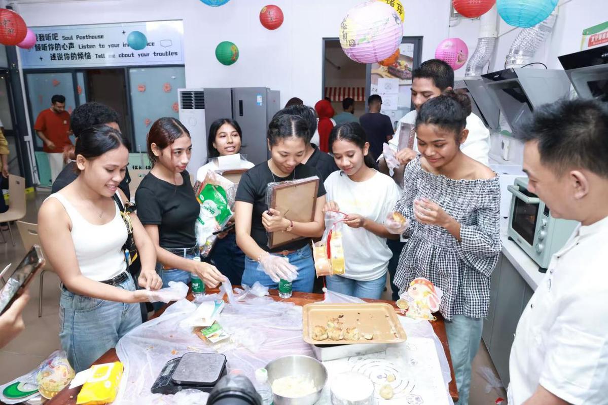 活动现场气氛热烈,中外学子在多个文化体验区沉浸式感受中华传统魅力。在月饼制作区,留学生亲手尝试冰皮月饼的揉面、包馅与压模,体验“以食寄情”的节日内涵。非遗琼式月饼传承人现场授课,讲解其历史渊源与制作精髓,学子们亲手实践开酥工艺,感受“软而不韧、酥而不脆”的独特口感。东帝汶学生品尝着自己烤制的月饼,喜悦之情溢于言表。