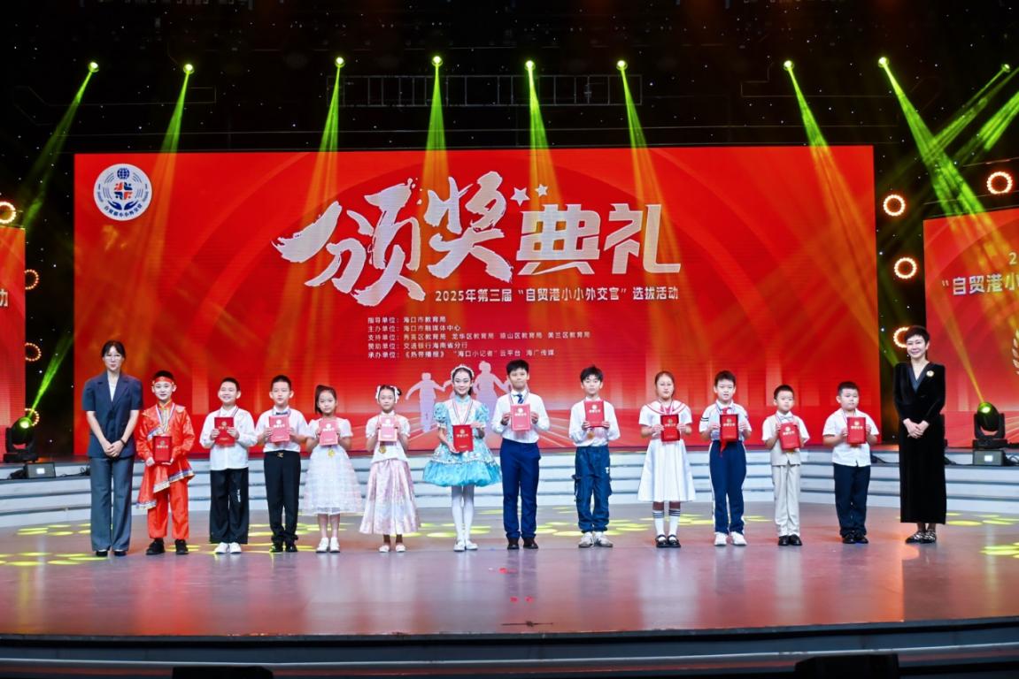 颁奖典礼现场,一系列富有特色的环节成为亮点。小选手们通过“我眼中的海口‘六个之城’”节目展示,以童真视角描绘海口发展蓝图;中英文双语才艺展示环节,尽显青少年国际视野;“我在小外交官天团中成长”发言环节,选手代表分享成长感悟,“在小外交官天团的历练中,我学会了用语言传递海口之美,用行动诠释自贸港青少年的责任与担当”,真挚话语引发在场观众共鸣。此外,25名“小外交官天团”成员与海口小记者代表共同登台,在主持人引领下庄严宣誓:“以青春之声讲好自贸港故事,用奋斗之力诠释新时代担当,自贸港有我,未来可期!”铿锵誓言回荡演播厅,彰显出青少年投身自贸港建设的坚定决心。