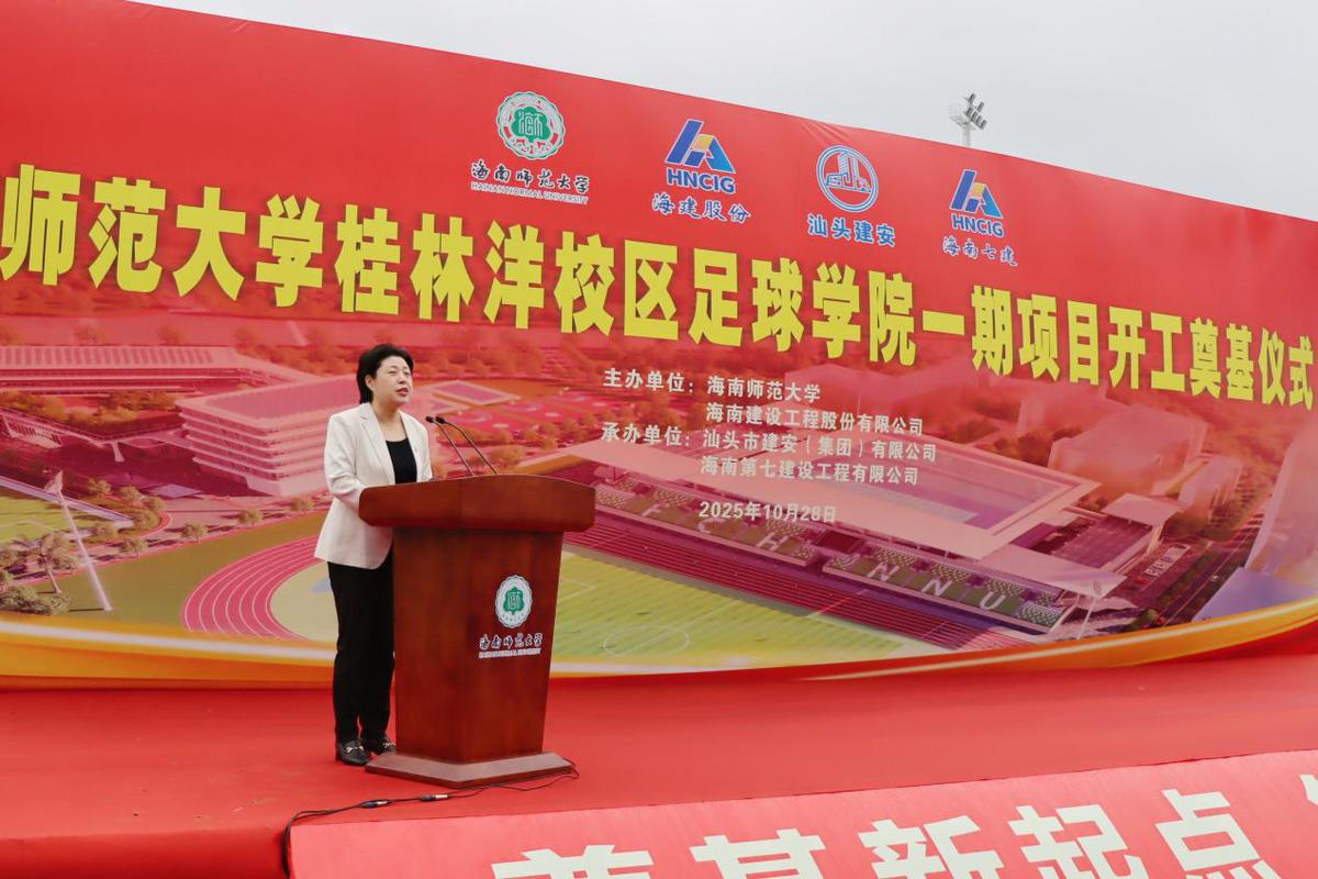 10月28日上午,海南师范大学桂林洋校区足球学院一期项目开工典礼举行。校党委书记许玫出席并宣布项目正式开工。校长聂清斌、副校长张引,桂林洋开发区管委会副主任杨玉忠等领导与嘉宾共同为项目奠基石培土,标志着这一重要工程全面启动。本次典礼由张引主持。