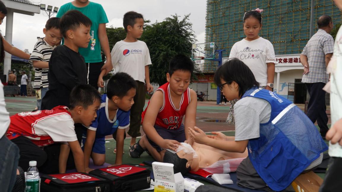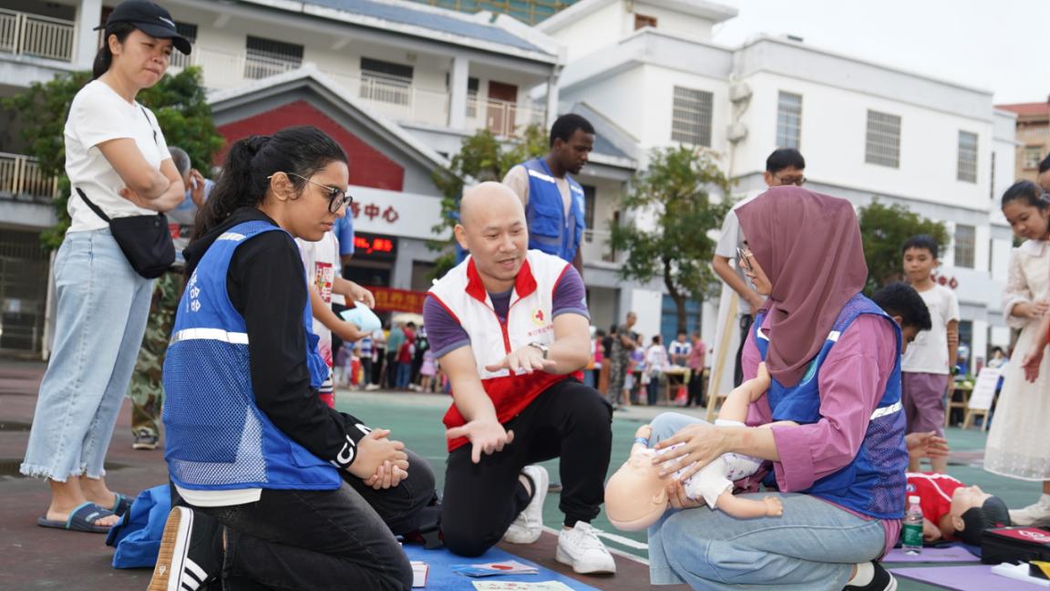 “应急救护”实践区也颇受关注,海口市红十字会救在身边志愿服务队队长王长福带领团队和国际青年志愿者们现场演示心肺复苏技能,并指导居民在模型上实操体验,普及基本急救知识。