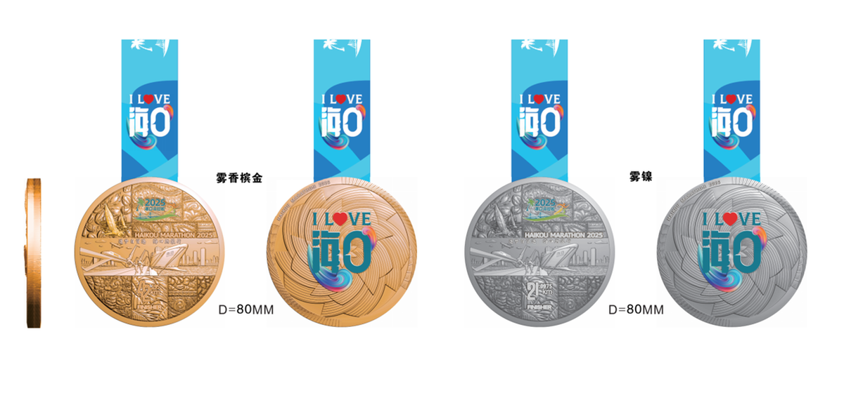 奖牌背面以旋转海浪与跑道轨迹交织,象征海南自贸港高速运转的发展节奏;“I LOVE 海口”作为视觉焦点,凝聚跑者对赛事与城市的深情,营造“跑马识城”的沉浸体验。整体设计兼顾战略高度与人文温度,既是跑者的荣耀见证,也是海口城市魅力与开放精神的浓缩载体。