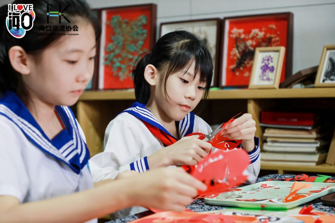 作为传统文化传承的重要载体,此次活动创新采用“课堂教学+研学实践”模式,邀请多位非遗代表性传承人亲授技艺。在黄海桃技能大师工作室,海口市第二十七小学的孩子们跟随秀英剪纸传承人黄海桃,剪出寓意吉祥的团花与灵动小鱼;海口市西湖实验学校和中国人民大学附属中学海口实验学校的学子,在东山草编传承人袁洁的指导下,将棕榈叶、草绳经编、缠、绕等技法,打造成独具韵味的手工艺品,感受这项宋末元初流传至今的技艺魅力。