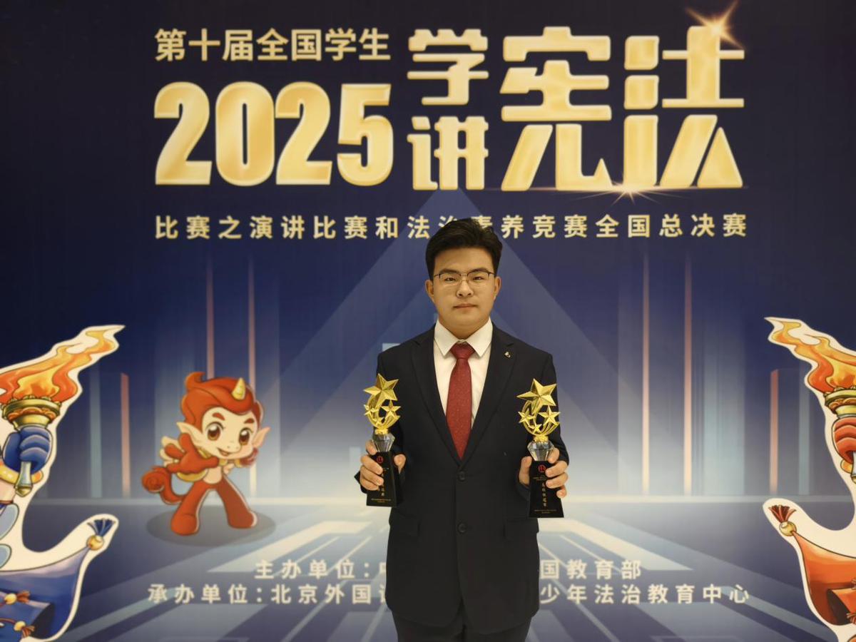 12月1日,第十届全国学生“学宪法 讲宪法”演讲比赛全国总决赛在北京落幕。海南大学法学院、椰风书院国际法专业2024级本科生崔子恒荣获全国高校组冠军、最佳表达奖。