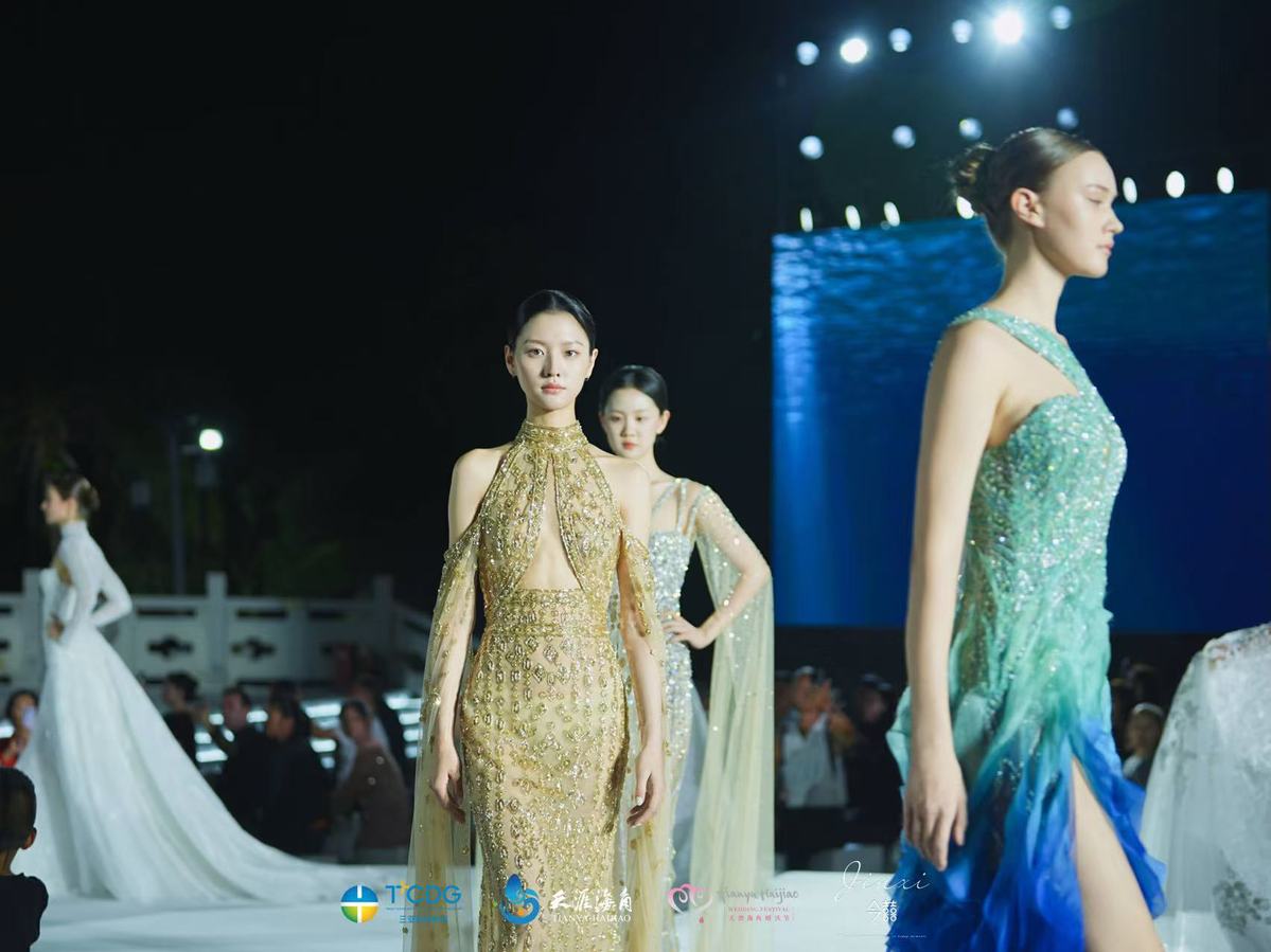 作为当晚的核心环节,本次“天涯时尚秀”力邀国际顶级婚纱礼服品牌TONYWARD进行专场发布。在璀璨灯光与轻柔海风的交织下,模特们身着奢华精致的高级定制礼服款款而行,将品牌的匠心工艺与天涯海角的浪漫意境完美融合,为现场嘉宾带来了一场震撼心灵的视觉盛宴,生动诠释了三亚作为“世界爱情之都”的时尚魅力与独特格调。