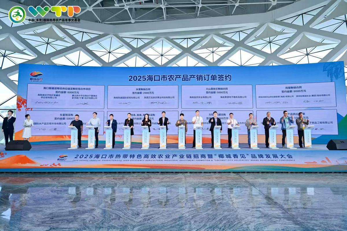 12月5日上午,由海口市人民政府主办,海口市农业农村局承办的2025海口市热带特色高效农业产业链招商暨“椰城香见”品牌发展大会在海南国际会展中心举办。大会举行了农业产业项目集中签约仪式以及农产品产销订单集中签约仪式,共有16个招商项目集中签约,总签约额约为8.41亿元;共有14宗产销订单签约,签约订单量2.88万吨,签约额10.78亿元。海南省农业农村厅、海口市人民政府及各区、各有关部门相关负责人,省内外客商、企业负责人等约350人参加活动。