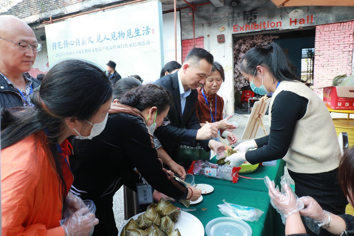 当日培训以“舌尖上的非遗”为核心,同步开展儋州粽子手工技艺、鸡屎藤馍制作技艺、腊肠制作技艺三项美食类非遗项目教学,丰富的体验内容吸引众多市民游客踊跃参与,现场学习氛围浓厚。