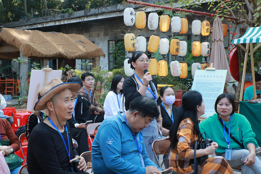 一旁的鸡屎藤馍制作区散发着自然气息。这种以野生植物鸡屎藤为原料的小吃,是儋州人记忆中的“童年味道”。“鸡屎藤被称为‘民间土参’,有清热解毒、促进消化等功效。”儋州鸡屎藤馍制作技艺老艺人曾彩富手持捣碎的鸡屎藤叶,向学员介绍其养生价值。从植物取色到揉面成型,学员们在传承人指导下体验了12道传统工艺。