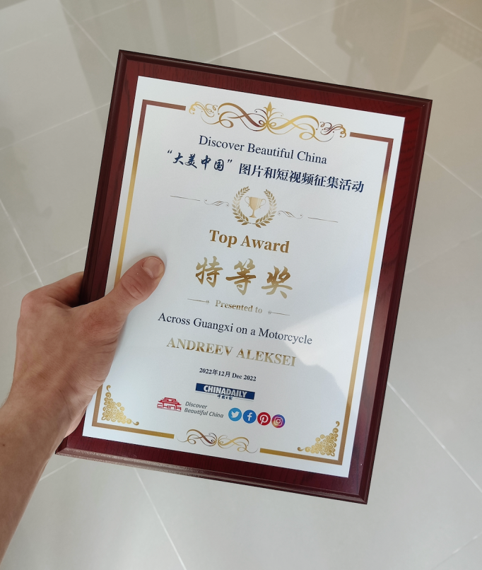 2022年,他的创作活力持续释放,在人民日报主办的 “奋斗的你”短视频大赛中,作品《彩云之路》拿下最佳创意奖;同年,其作品《老外骑摩托车穿越广西》更在中国日报社主办的“大美中国”短视频大赛中斩获特等奖,该作品以骑行视角记录广西的山水人文,让海外受众感受到中国地域文化的多元魅力。