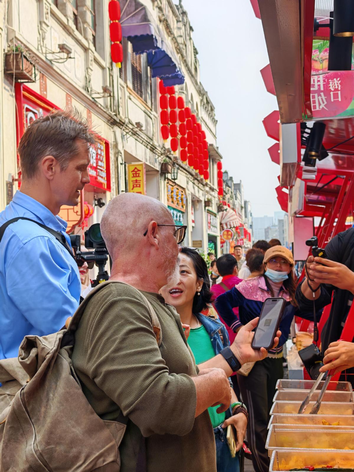 活动以特色点位研学拉开序幕。中外嘉宾沿着中共琼崖一大旧址、博爱南路年货街、骑楼老街等标志性地点展开行走体验。在中共琼崖一大旧址,英文讲解员生动讲述红色历史,让嘉宾们深入感悟海口深厚的革命文化底蕴;博爱南路年货街上,志愿者沿途提供细致指引与讲解,嘉宾们驻足询问年货寓意、挑选特色商品,沉浸式感受老街的烟火气息;中山路骑楼老街中,南洋风格与本土文化交融的建筑风貌令人驻足,嘉宾们聆听建筑历史渊源与商业文化价值讲解,触摸百年骑楼的独特韵味。